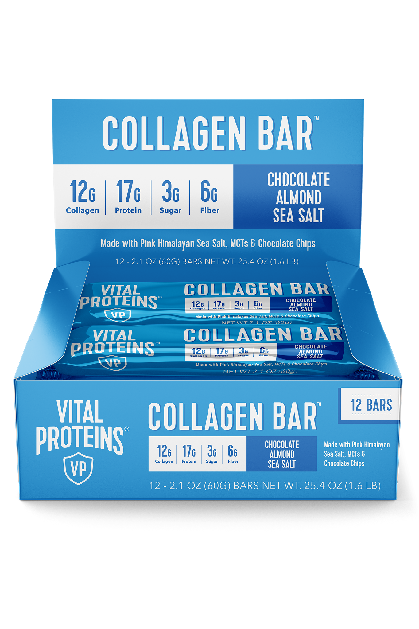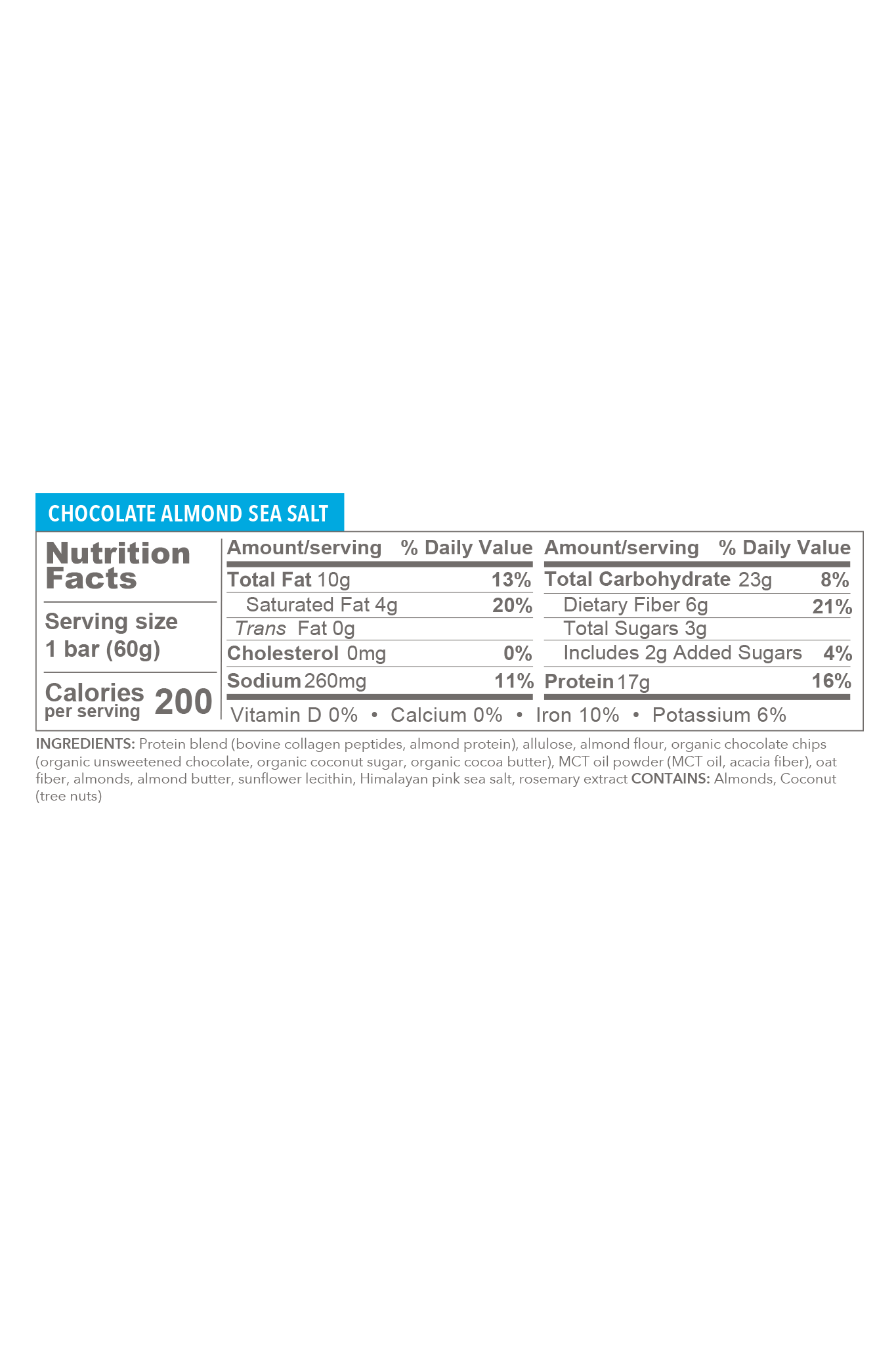 Make every moment worth biting for with our Chocolate Almond Sea Salt Collagen Bars ™ . Boasting 12g of collagen per bar and only 3g of sugar, you’ve now found the tastiest way to boost your collagen intake. Made with Pink Himalayan Sea Salt, MCTs & Chocolate Chips, satisfy your sweet and salty cravings while keeping your wellness goals in check.
