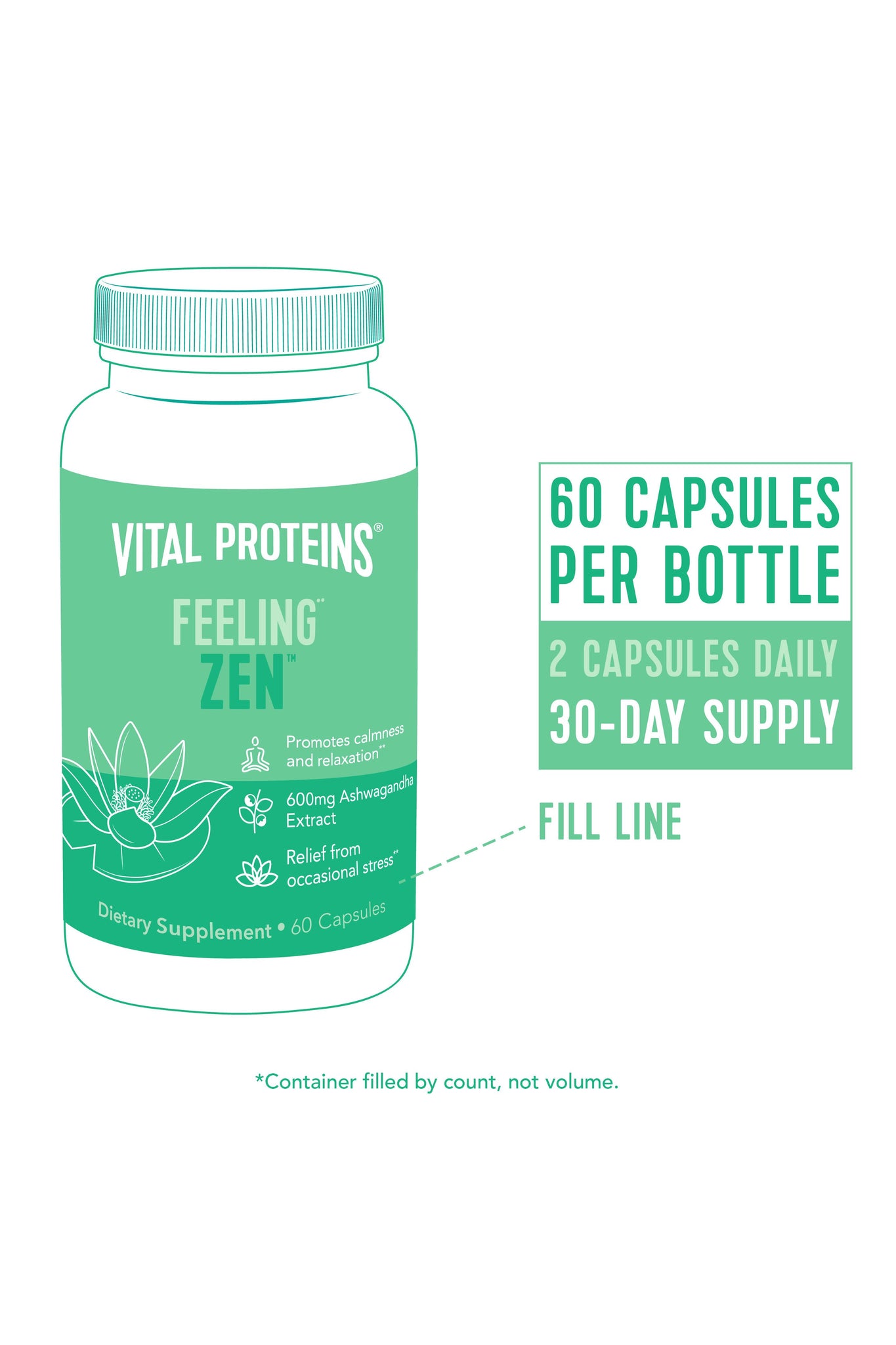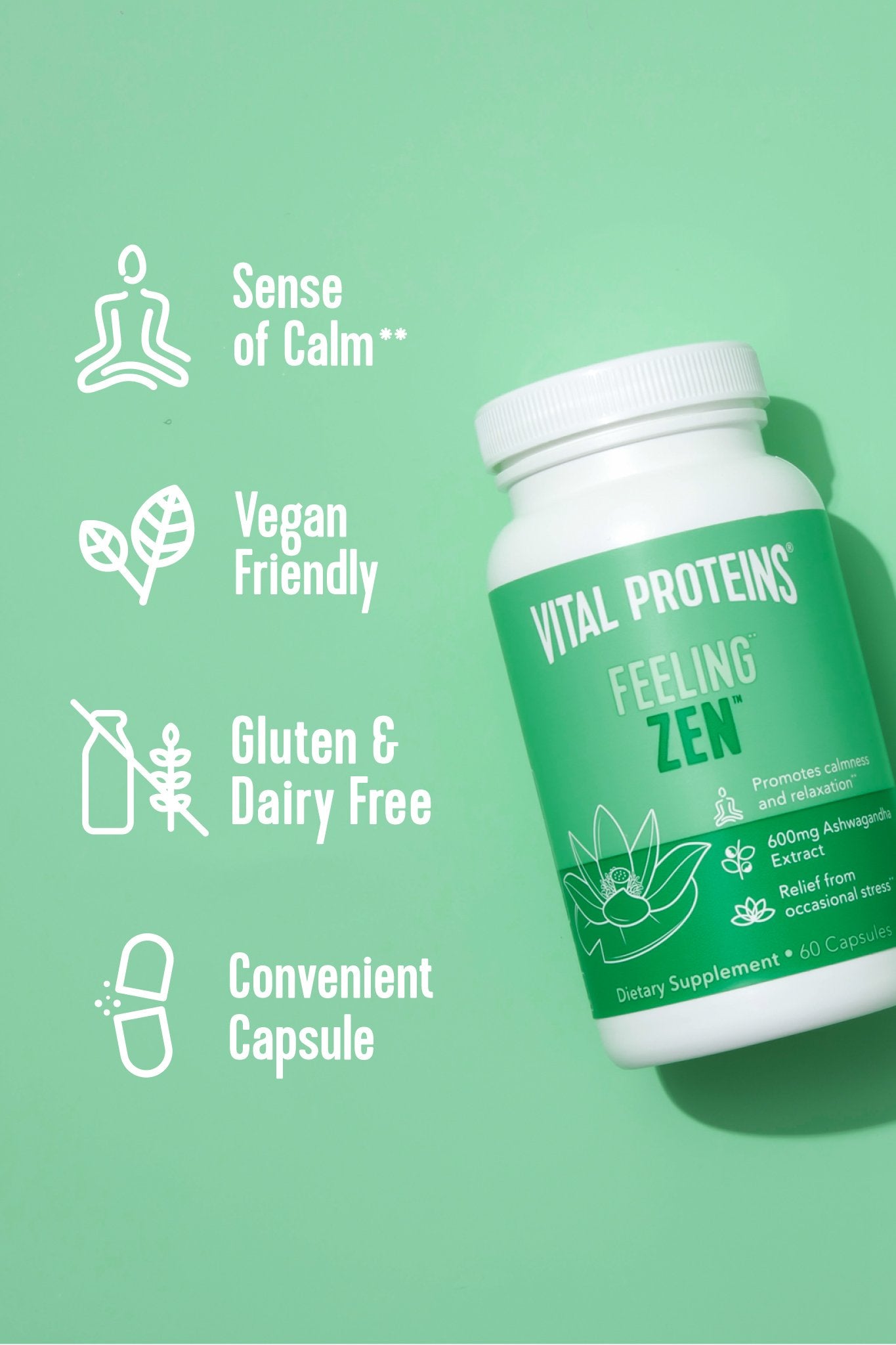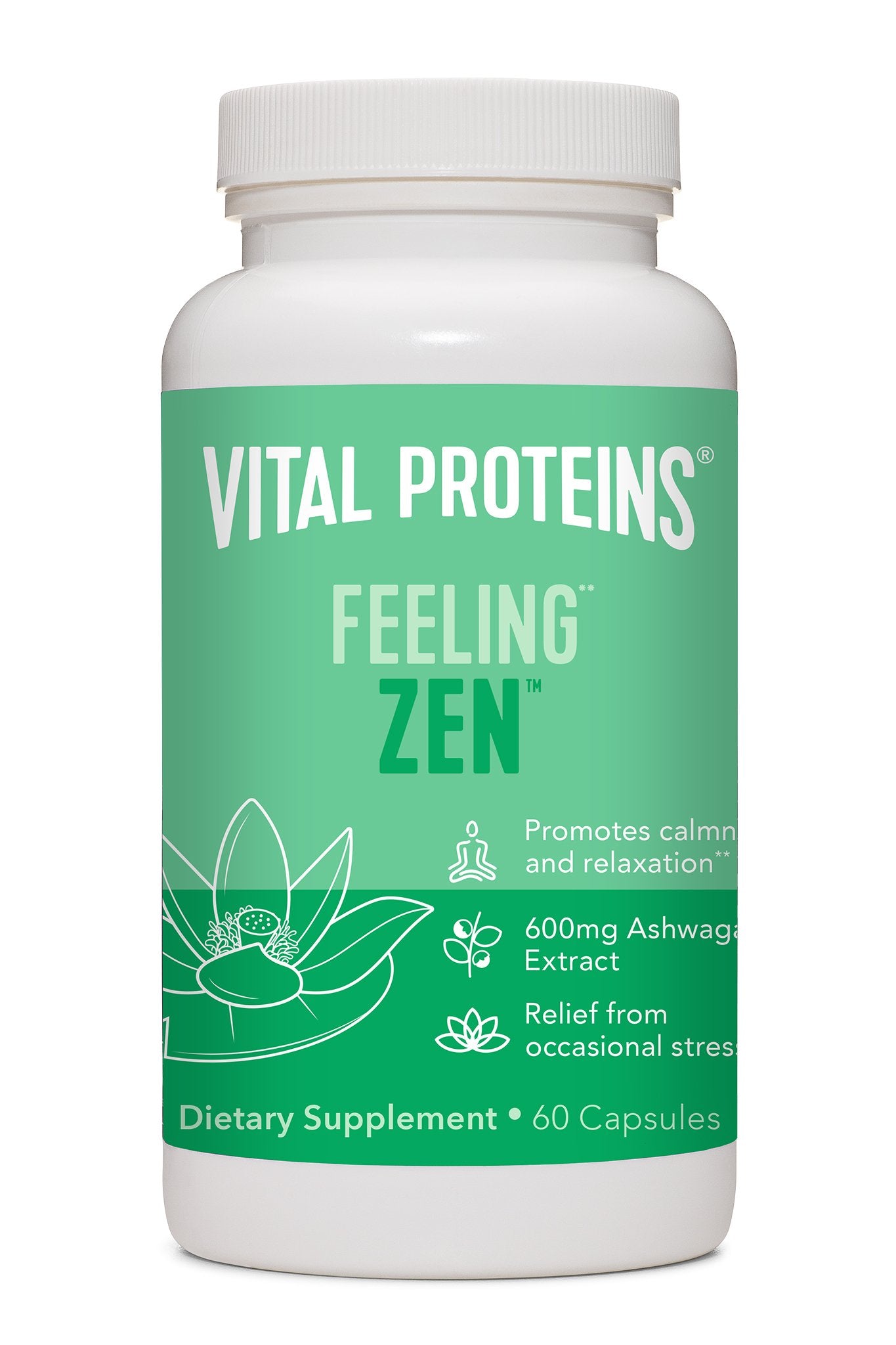 Vital Proteins Feeling Zen™ is a convenient, plant-based capsule that combines organic ashwagandha root extract, L-Theanine, GABA and magnesium, which are all premium, functional ingredients that promote calmness and relaxation.**
